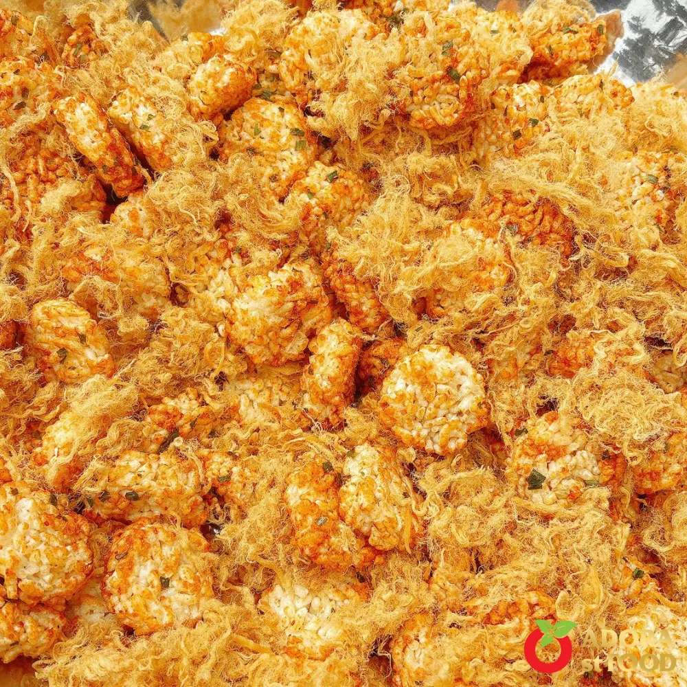 Mini Crispy Rice with Fluffy Pork Floss is a beloved Vietnamese snack made from bite-sized crispy rice pieces, lightly seasoned and generously tossed with soft, savory pork floss. Crunchy, fragrant, and rich in umami flavor, this snack delivers a satisfying taste with every bite.